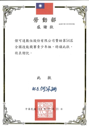 傑可達數位股份有限公司於2024年參與協辦「第54屆全國技能競賽」,並榮獲勞動部頒發感謝狀,表彰公司對技職教育發展與專業技能推廣之支持與貢獻。