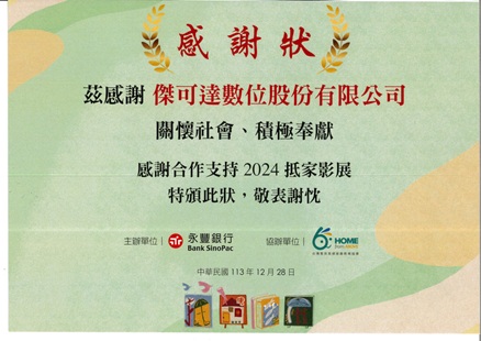 傑可達數位股份有限公司於2024年協辦「2024抵家影展」成果發表會,並榮獲主辦單位頒發感謝狀,肯定公司在活動設備支援與影像整合應用上的專業協助,表彰其對文化教育推廣與社會關懷的積極投入。