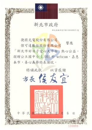 傑可達數位股份有限公司於2021年響應「新北市好日子愛心大平台」公益行動,捐贈公立國中小1,000台webcam設備,協助改善疫情期間遠距教學所需之基礎設備,並榮獲新北市政府頒發感謝狀,肯定公司對教育公益與社會關懷之積極投入。