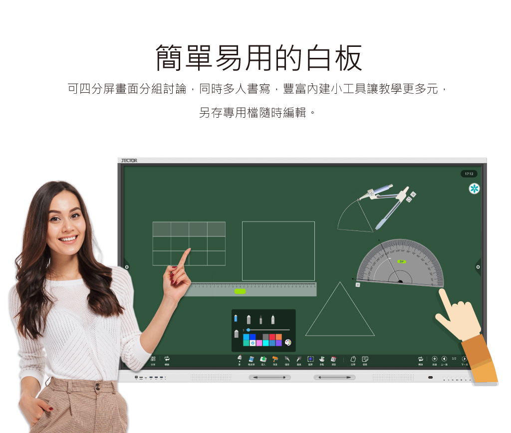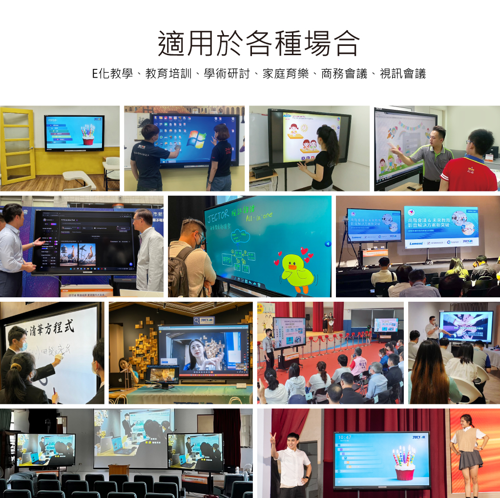 | 產品特點 | 支援雙系統 – Windows / Android;白板模式、畫面共享、預覽訊號、前置喇叭、定時開關機、USB直接讀檔、USB 3.0 攝影機支援、白板互動軟體、螢幕錄製、客製化主題及桌布設定、可自訂懸浮工具列功能 |