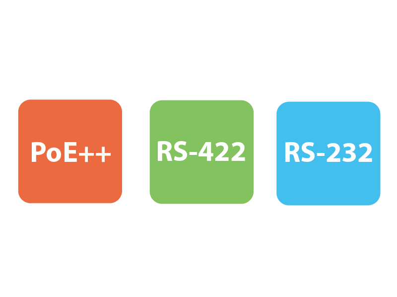 可使用專用 12V DC 供電,或透過 PoE++ 供電;支援多種控制協定(VISCA、Pelco、Onvif、UVC)及介面(RS-232、RS-422、Ethernet、USB 3.0),便於整合於既有設備。