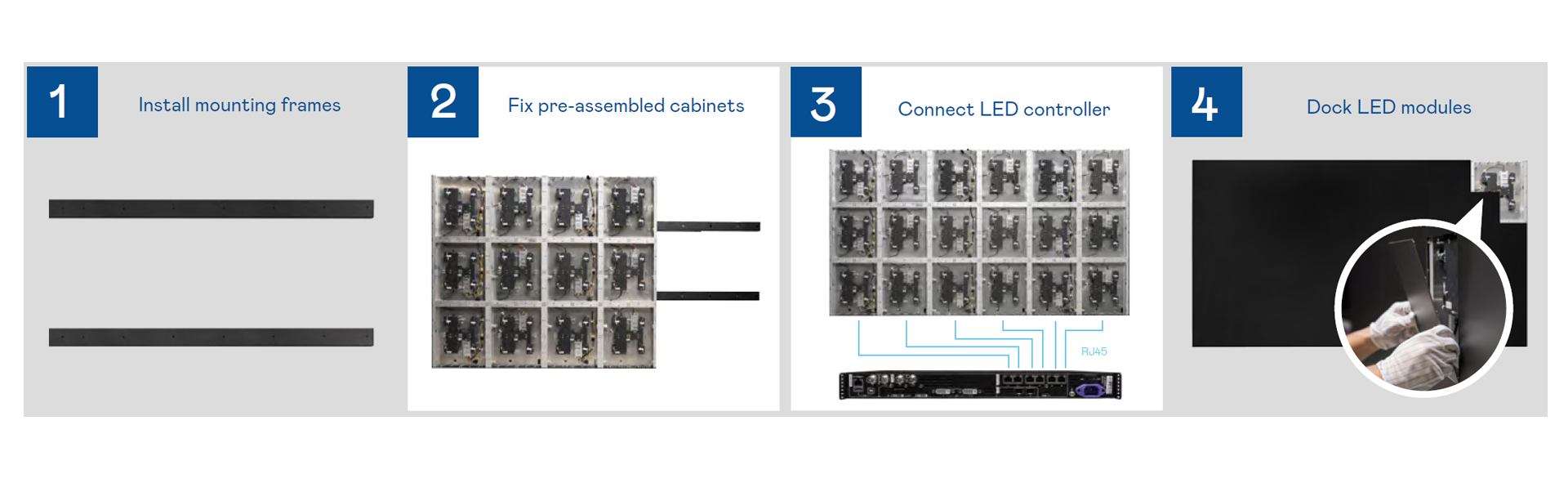 AUO Display Plus LX-130 LED 拼接顯示系統預組裝機櫃、LED 模塊、安裝架、LED 控制器以及網絡和電源線裝在便於運輸的航空箱中,2 人可在 2 小時內輕鬆安裝。憑藉巧妙的模塊化設計,每個 LED 模塊自動校准其位置值,為您節省繁瑣的連接時間。