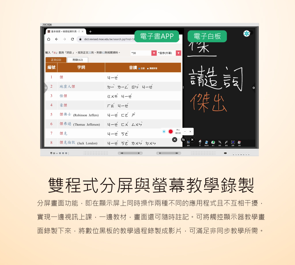 | 產品特點 | 支援雙系統 – Windows / Android;白板模式、畫面共享、預覽訊號、前置喇叭、定時開關機、USB直接讀檔、USB 3.0 攝影機支援、白板互動軟體、螢幕錄製、客製化主題及桌布設定、可自訂懸浮工具列功能 |